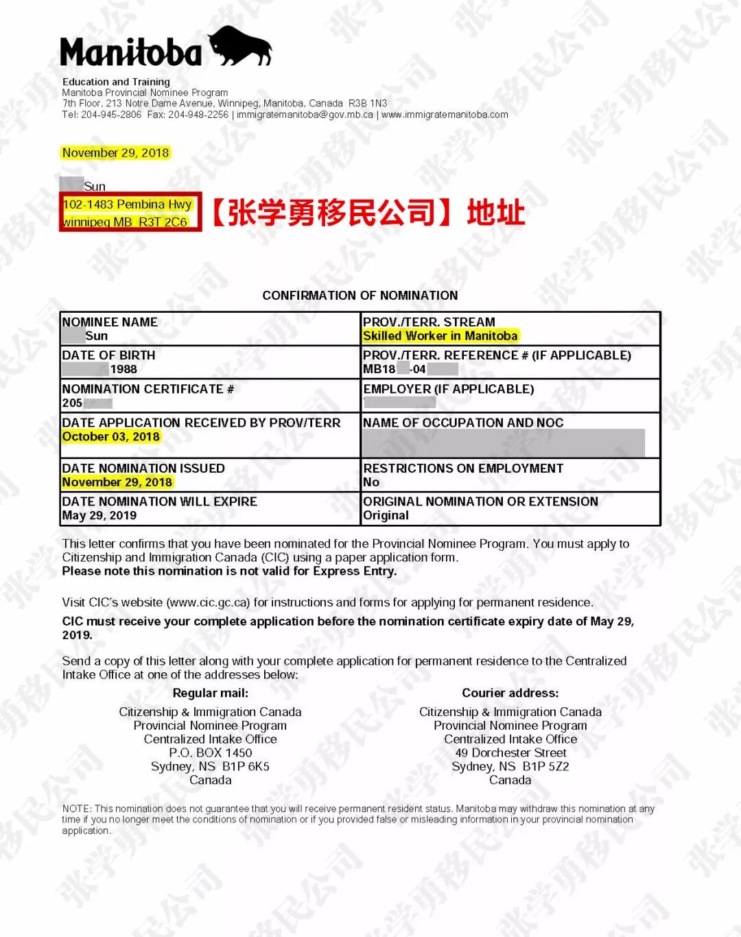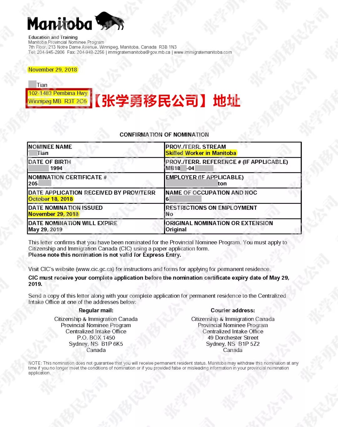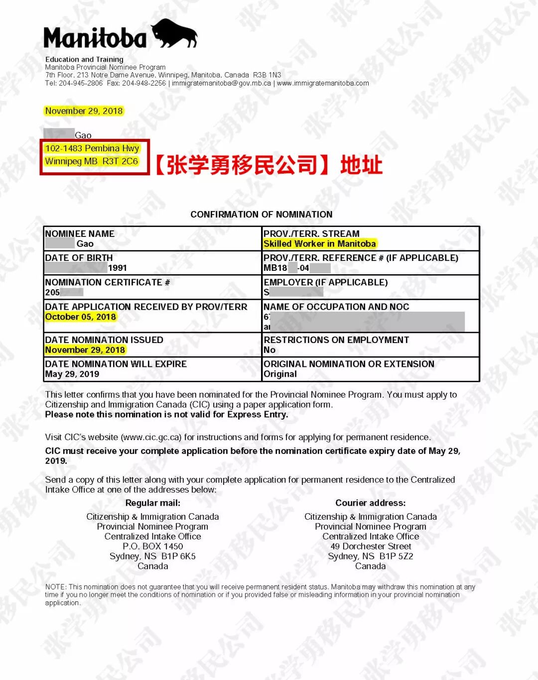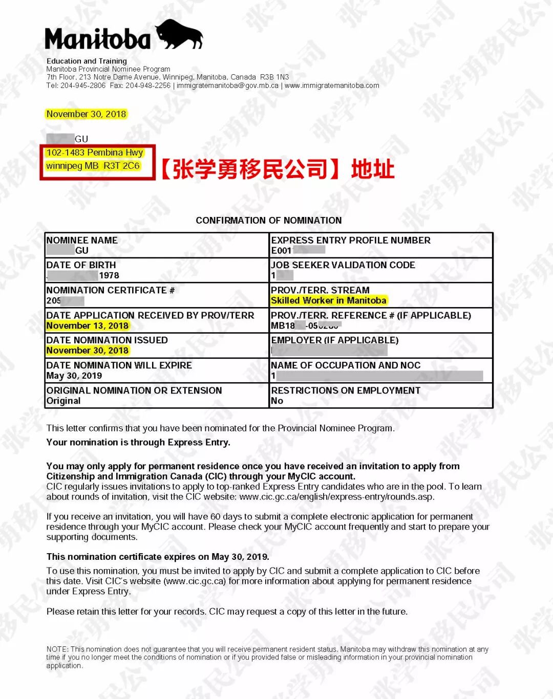 高同学2016年毕业于安省学院,拿着三年工签却移民无望,2017年转投【张学勇移民公司】曼省工作移民一条龙项目后,很快找到了符合曼省移民条件的雇主,工作一年后于今年10月5日递交省提名,11月29日获批省提名信,12月5日收到提名通知。