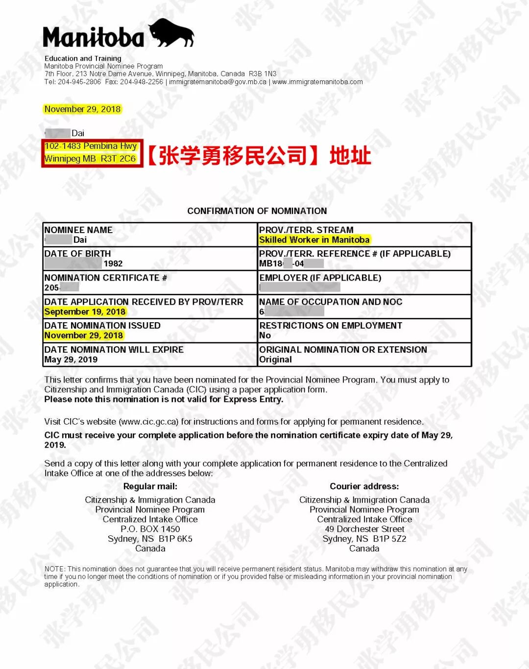 戴同学是【张学勇移民公司】留学移民一条龙客户,于2018年年初毕业于酒店管理独家班,工作6个月后于9月19日递交曼省省提名,11月29日获提名,12月5日收到提名通知。