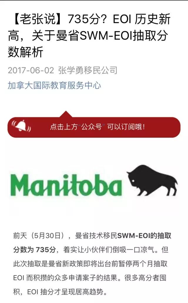 早在6月2日(如下文老张说),EOI 抽分735分的时候,老张就明确预测说过,由于曼省移民政策的变动和申请名额的增加,曼省境内类SWM EOI抽分肯定会大大下降;果不其然,曼省移民局拿出实际行动欢迎加拿大各省的留学生来到曼省留学+工作+移民。想要移民还在观望曼省移民政策的广大留学生们,曼省已经敞开怀抱等着您的到来!!!