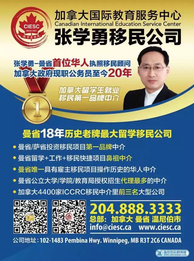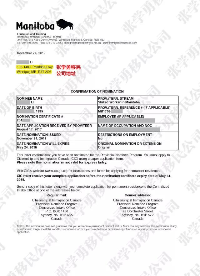 陈同学毕业于安省Seneca College,拿到工签后还在安省工作过一段时间,后来曼省委托【张学勇移民公司】办理工作移民,EOI 扣 200分,现已成功获得曼省移民省提名!!!