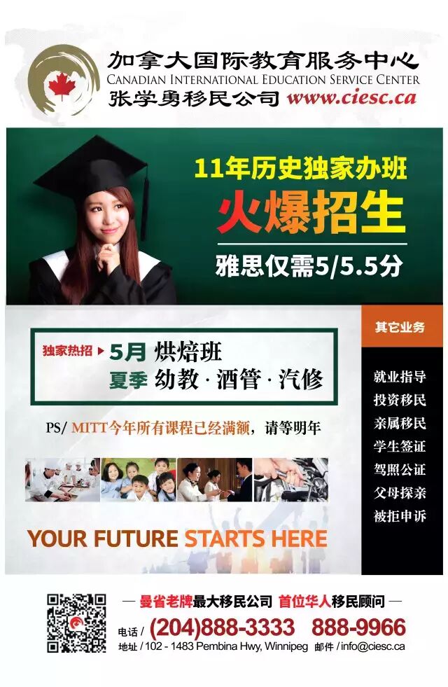 老张牌主持人小张随着【张学勇移民公司】2005年开始与WTC(现名MITT)的合作独家办班,10个月的快捷移民项目被越来越多的人所熟知。随着加拿大其他省份的移民越来越难,越来越多的人选择来到曼省就读,并进入快捷移民项目。现如今,2016年5月和9月,MITT的所有专业课都已满员,名额有限,学位紧缺,导致众多童鞋们无法入学;即便是英语成绩达到入学标准,最快也要等到2017年1月份上学了。雅思成绩需要6.5的红河学院,所剩专业也是寥寥无几 – 快捷移民项目就是这么的火爆!!!兔兔兔那我们还能上学吗?