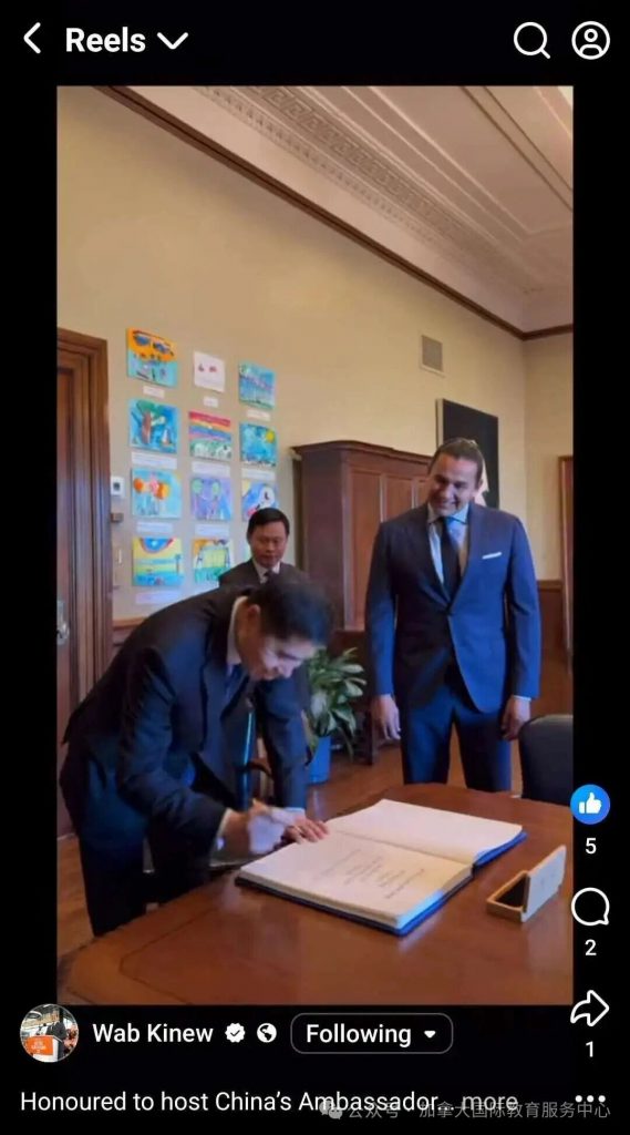 次日,11月12日,王镝大使约见曼省省长 Wab Kinew,洽谈中加经济贸易投资等合作事宜。