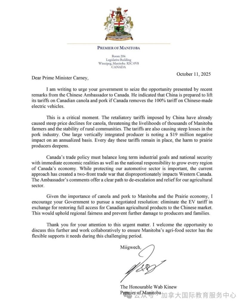 下文是曼省省长于10月11日写给加拿大总理 Mark Carney的公函, 呼吁加拿大联邦政府,减除加拿大对中国进口电动车关税,争取中国进口加拿大农产品(包括油菜籽和猪肉)。